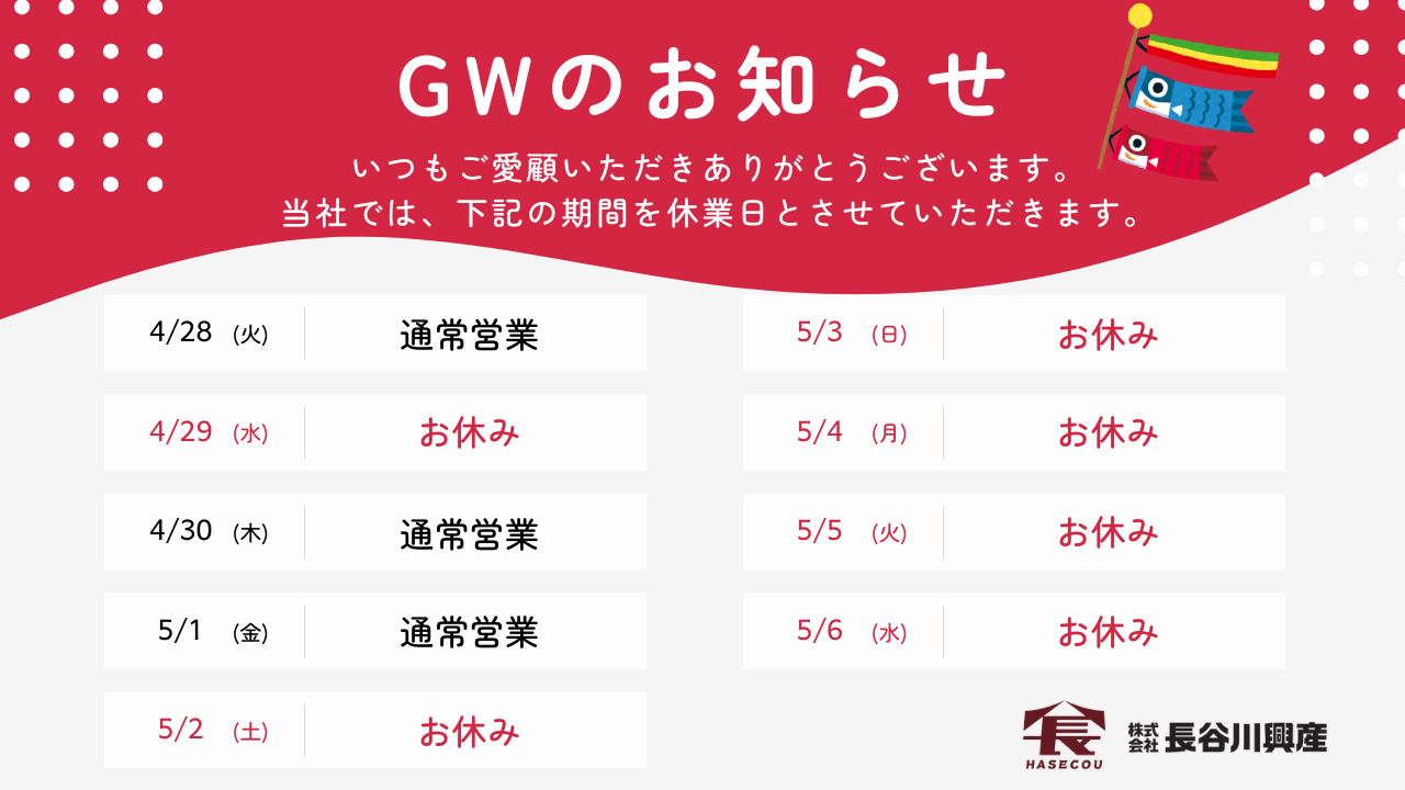 長谷川興産のGW休暇をお知らせいたします。